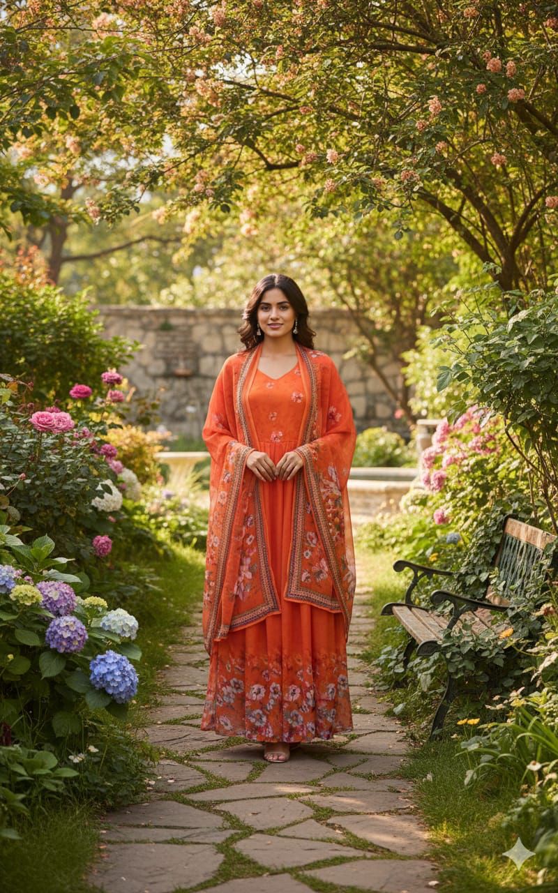 | Ornamentation | The flowy ghera silhouette with vibrant floral prints adds a fresh, feminine charm, while the soft chiffon fabric gives a lightweight and graceful fall. Fully lined for confidence and comfort |
