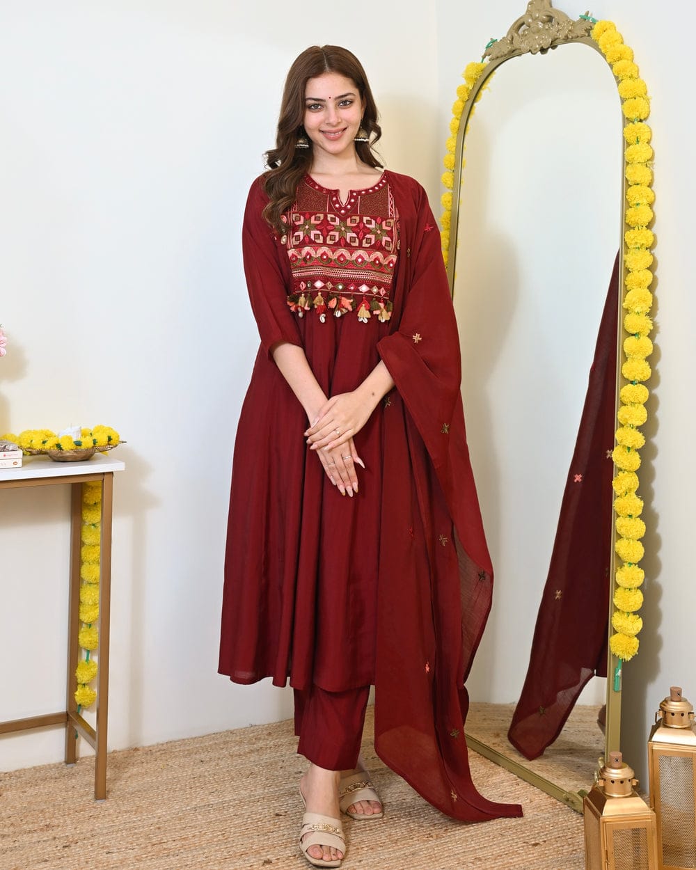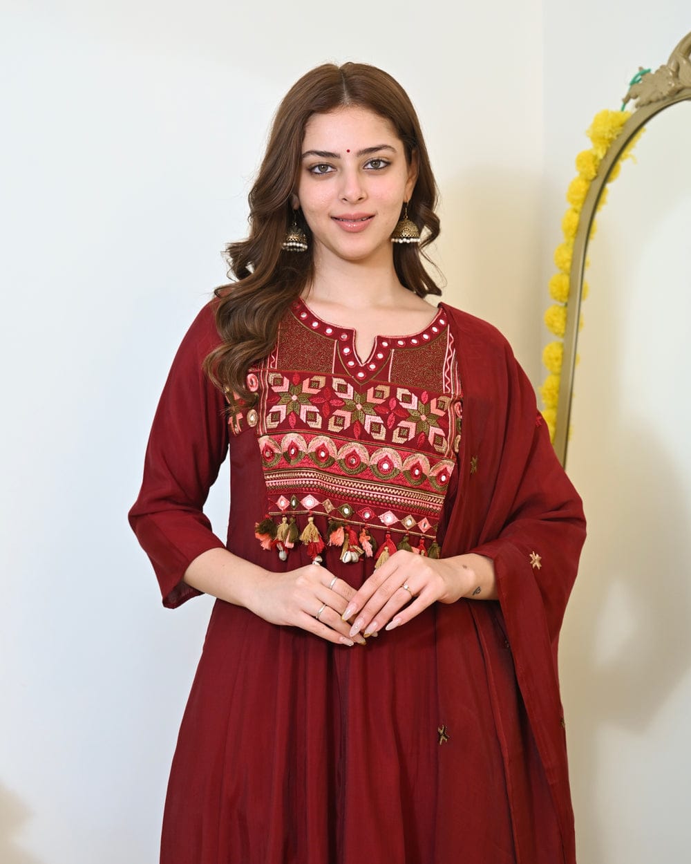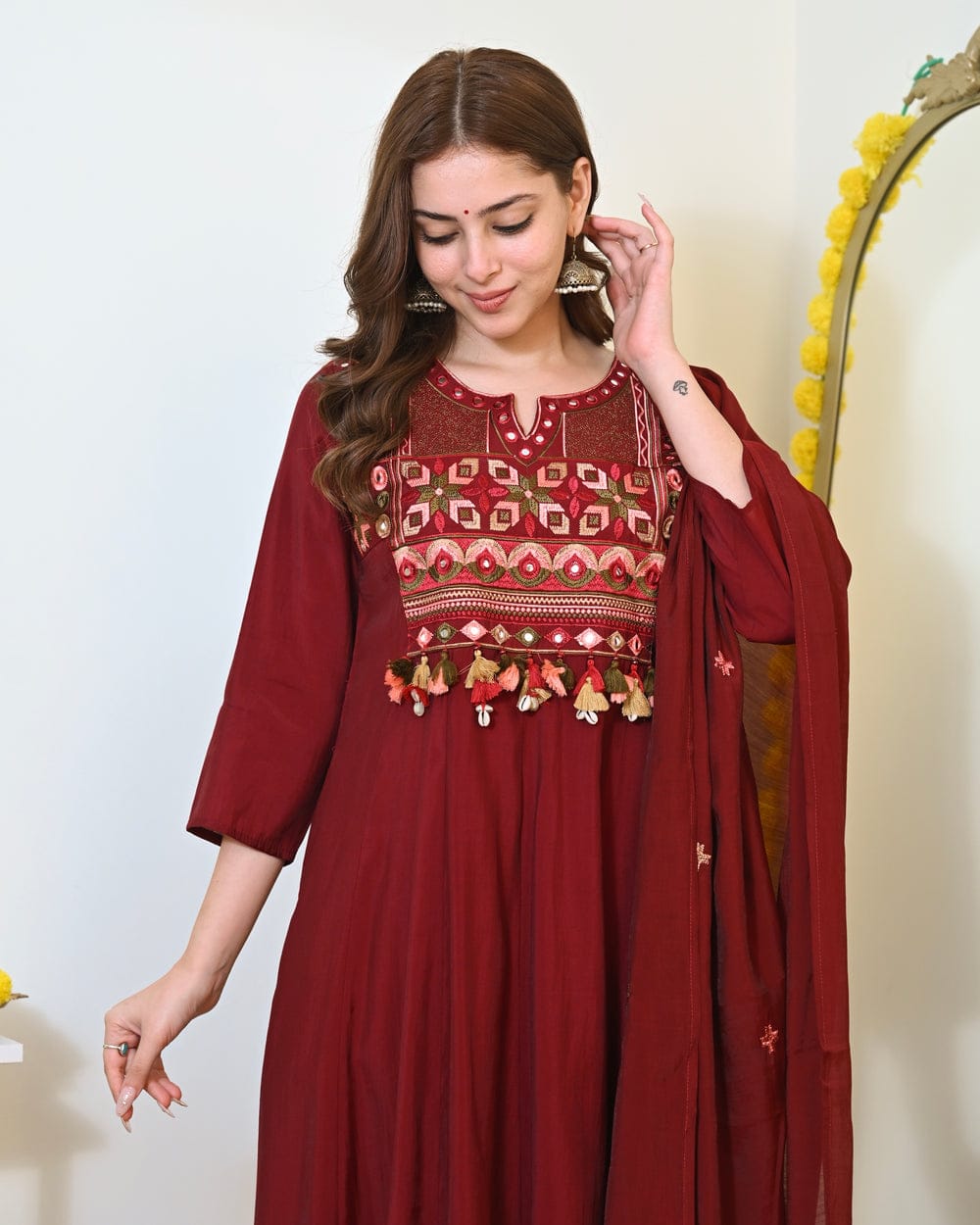 | Ornamentation | 1. For all the stylish ladies out there, who want something simple, sophisticated and traditional 2. Rich Embroidery on yoke ....Anarkali style One side pocket |