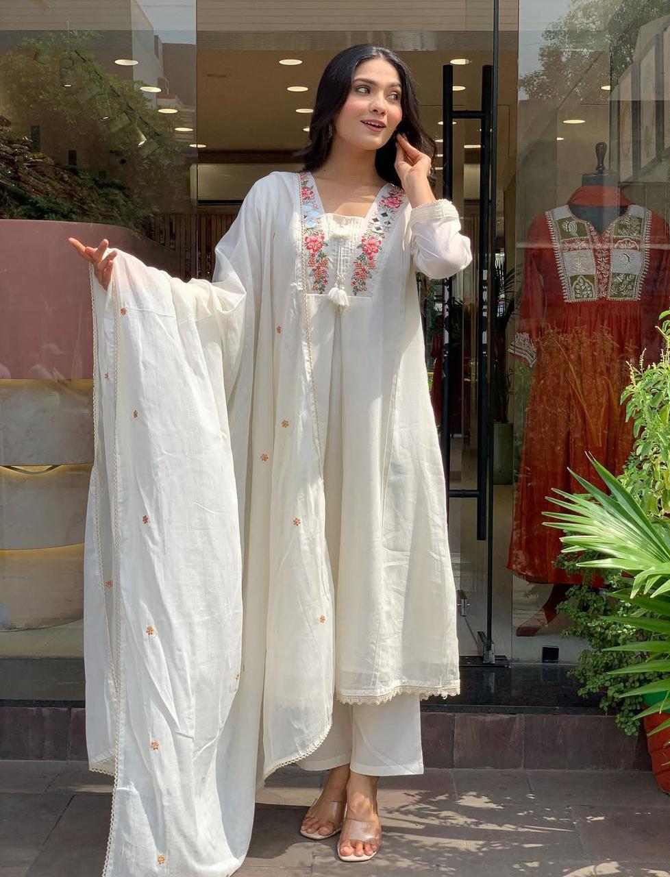 | Ornamentation | 🌼Abstract Pure Cotton set heavy embroidery on Aline kurta with Lining Attached & Printex Detailing highlights and beautiful embroidery and hand work It is paired with matching pants. A must've for your upcoming gatherings |